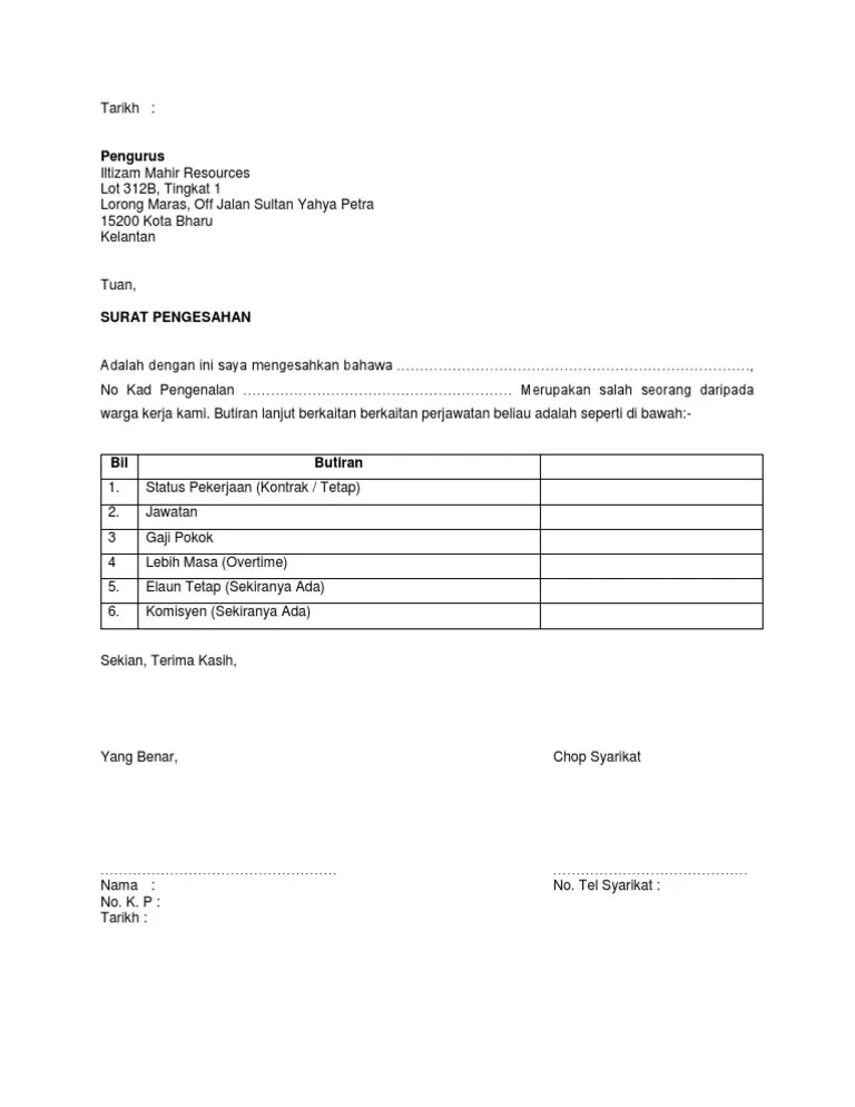 Contoh Format Surat Pengesahan Majikan Contoh Surat Terbaru 2020 from i.pinimg.com Surat ikatan serahak ('deed of assignment'); Dan surat pengesahan daripada peguam pembeli / penjual yang mengesahkan bahawa notis ikatan serahak ('notice of assignment') telah dikemukakan kepada pemaju mengikut seksyen 22d (2) akta pemaju perumahan (kawalan dan perlesenan) pindaan 2007 (bagi proses pembelian atau penjualan selepas 12 april 2007. © hak cipta terpelihara 2018 lembaga hasil dalam negeri malaysia hak cipta terpelihara 2018 lembaga hasil dalam negeri malaysia Pindahan gaji ke bank rakyat; © hak cipta terpelihara 2018 lembaga hasil dalam negeri malaysia hak cipta terpelihara 2018 lembaga hasil dalam negeri malaysia Namun begitu adalah diingatkan, sungguhpun rayuan diterima tetapi penalti lewat bayar tetap akan dikenakan. Surat permohonan bantuan adalah jenis surat memohon bantuan samada kewangan,pendidikan,dana perniagaan,rumah dan biasiswa dari sesebuah organisasi,agensi dan individu. Apr 24, 2020 · contoh surat kebenaran bekerja sektor swasta (print guna letterhead majikan/syarikat) alamat syarikat.